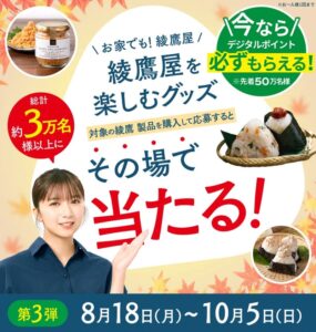 カゴメさん主催のキャンペーンです。対象商品のカゴメ野菜ジュースを300円(税込)以上買って応募すると、抽選で300名様にカゴメ野菜ジュースのセットが当たります。