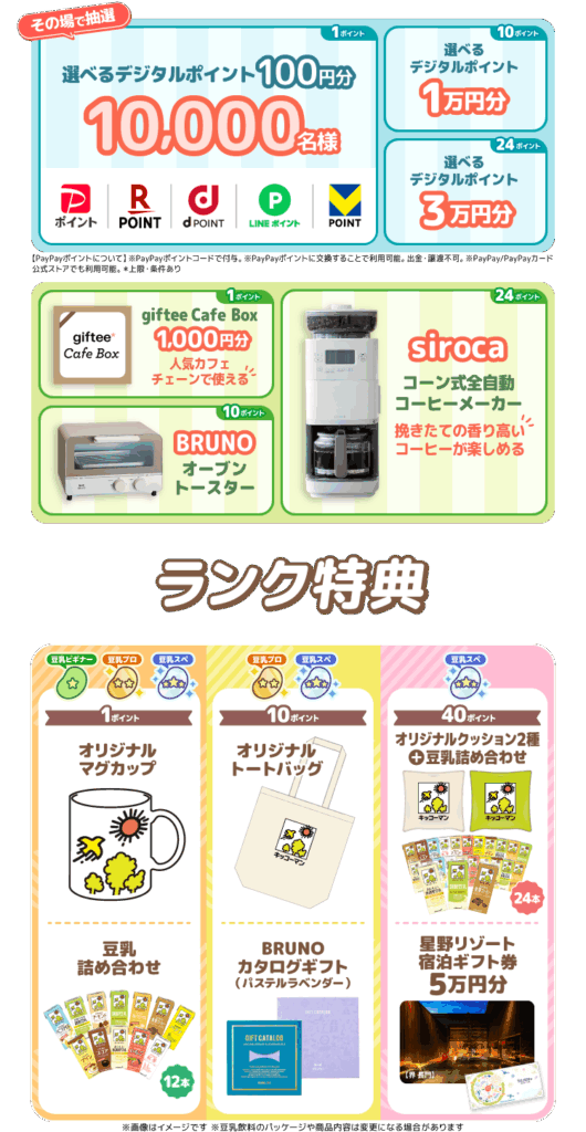 キッコーマンソイフーズ株式会社さんが実施しているプレゼントキャンペーンです。抽選で「選べるデジタルポイント」や「BURUNOオーブントースター」「sirocaコーン式全自動コーヒーメーカー」などが当たります。対象商品を購入してポイントを貯めてキャンペーンサイトから応募できます。